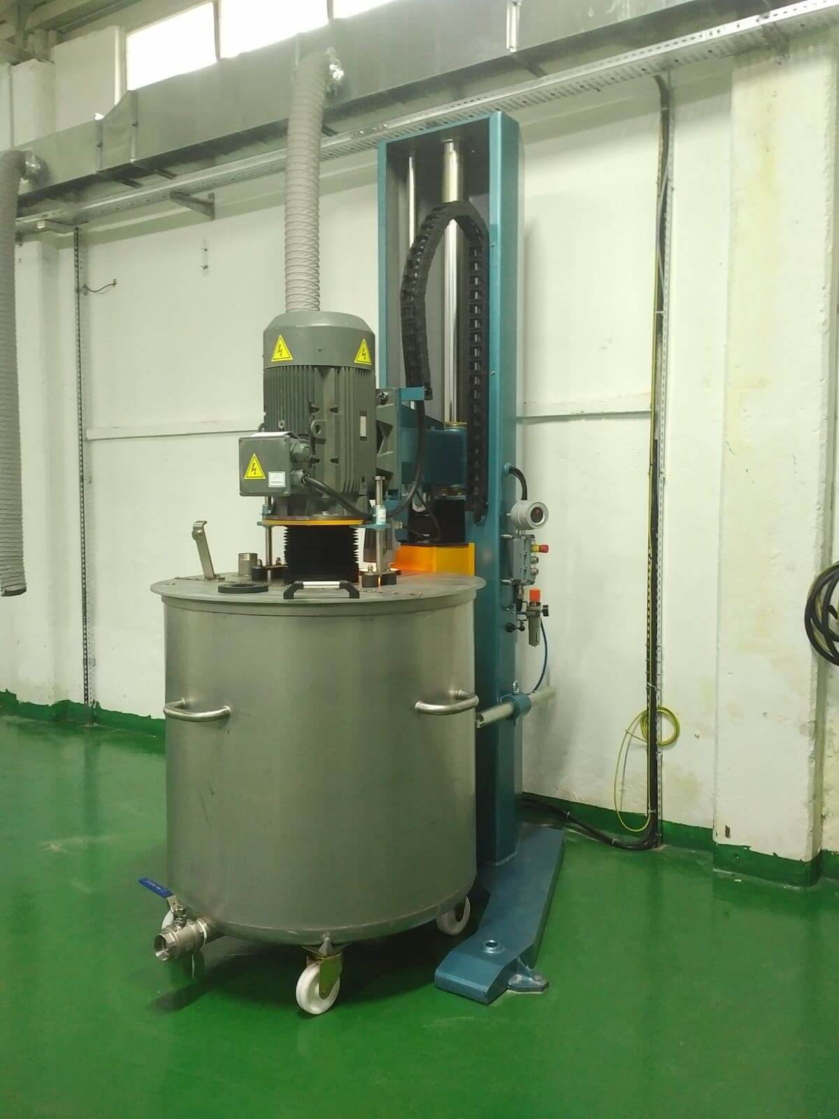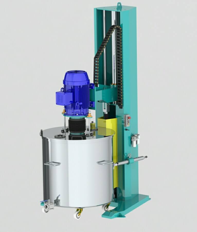 В смесителе колонны (диспергаторе) движение смесителя вверх и вниз обеспечивается с помощью гидропневматической системы. Поскольку эта система не несет опасности возгорания, она значительно дешевле, особенно в системах, которые используются для смешивания легковоспламеняющихся и горючих продуктов и которые должны быть взрывозащищенными. Кроме того, это движение обеспечивает серьезную экономию энергии, поскольку оно выполняется с помощью воздуха вместо электричества. Рычаг вверх и вниз смесителя колонны (диспергатор) и кнопки управления вращением установлены на колонке смесителя (диспергатор). Оператор также может легко наблюдать за смесью во время движения. Оператор может видеть скорость и скорость смеси. При желании можно автоматически регулировать время перемешивания, время окончания смешивания и скорость перемешивания.