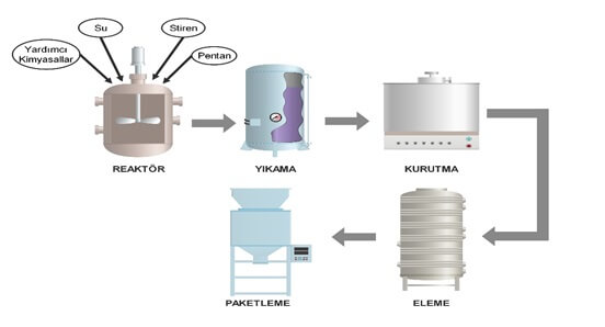 Вспенивающийся полистирол получают методом суспензионной полимеризации стирольного мономера периодическим способом. Стирол, органические ингибиторы, деминерализованную воду и различные добавки заливают в реакторы с мешалками. Реакторы бывают разных размеров. Капли суспендированного стирола полимеризуются и превращаются в полистирол. Во время реакции полимеризации реакторы держат под контролем, время от времени нагревая и охлаждая время от времени. Затем пентан добавляется в качестве вспенивающего агента и поглощается частицами. Благодаря добавленным вспомогательным химикатам, размеры и плотность гранул EPS регулируются. Реактор опорожняется, а частицы отбираются в моечные баки и оттуда отправляются в сушилку. В центробежных сушилках вода в продукте удаляется. Гранулы забираются в бункеры после сушки. Они сушатся немного больше во время этого процесса. Затем гранулы отправляются на сита для разделения в соответствии с их размерами. Гранулы, отделенные по размерам, передаются в бункеры отдельно. Перед упаковкой к гранулам в бункерах добавляют химическое поверхностное покрытие, чтобы уменьшить трение во время работ по расширению. В процессах упаковки и сушки к продукту добавляются вещества, снижающие статическое электричество. Таким образом, потребитель, который будет использовать продукт, не сталкивается с проблемой статичности. Во время всех процессов продукт изнашивается от промежуточного продукта к образцу, и его проверяют в лаборатории, чтобы убедиться, что процессы продолжаются успешно.