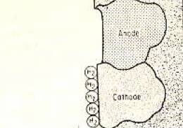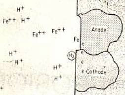 Если мы помещаем простой кусок железа в раствор соляной кислоты, мы наблюдаем образование плотного газообразного водорода. На поверхности металла имеются многочисленные мелкие анодные и катодные области, вызванные остатками, называемыми незначительными включениями, неровностями поверхности, различными проявлениями напряжений, областями и различными ориентациями ячеек или изменениями условий окружающей среды. Эти условия схематически показаны на рисунке 1.