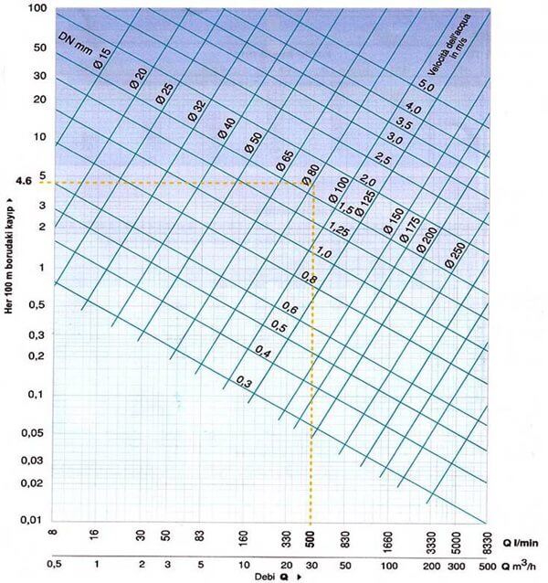 ПРИМЕР: Расход Q = 500 л / мин, диаметр новой железной трубы 80 мм, длина 50 м. Найти расход по горизонтальной оси, вертикально следовать пересечению DN 80 мм, найти потери на трение по вертикальной оси.
